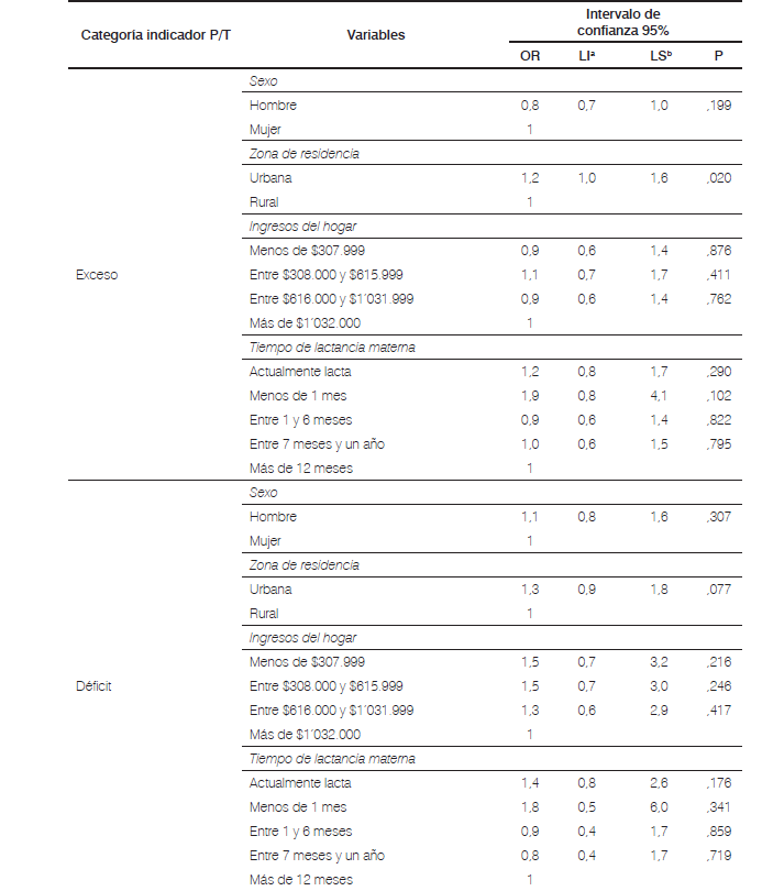 Se construyó un modelo de regresión logística multinomial para explorar los factores que probablemente incrementan el riesgo de malnutrición según el indicador peso para la talla (0-4); el riesgo de malnutrición por déficit fue mayor en los hombres, en quienes residían en la zona urbana, en familias cuyos ingresos no excedían $615.999 y en niños/niñas, cuyo tiempo de lactancia fue menor de un mes, aunque las diferencias, en todos los casos, no fueron significativas (p>0,05). En cuanto al riesgo de malnutrición por exceso, este fue mayor en las niñas, en hogares que tenían ingresos entre $308 y $615.999, y cuyas madres los lactaron menos de 1, pero sin diferencias estadísticas: nótese que la malnutrición por exceso fue mayor en los niños/niñas de la zona urbana, con diferencias significativas con respecto a la rural: el riesgo de malnutrición por exceso fue del 20% mayor en la primera (Tabla 5).