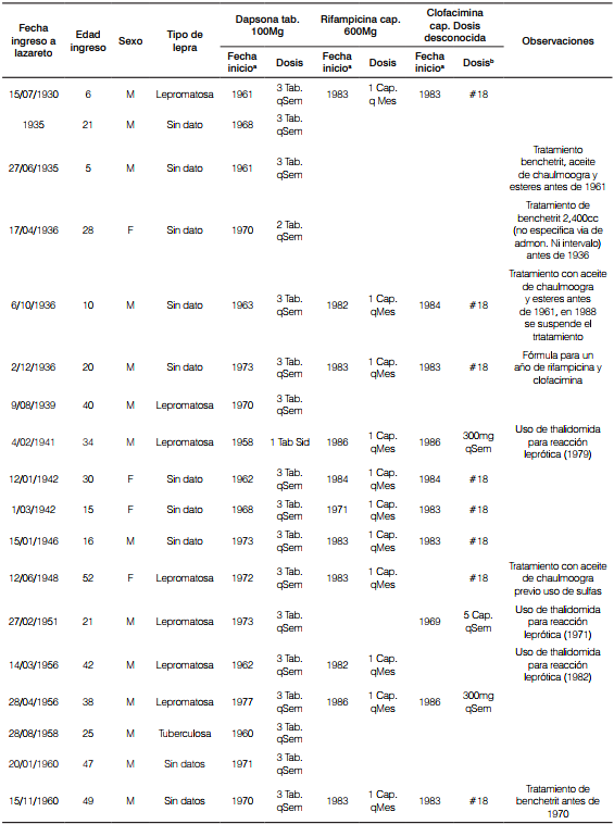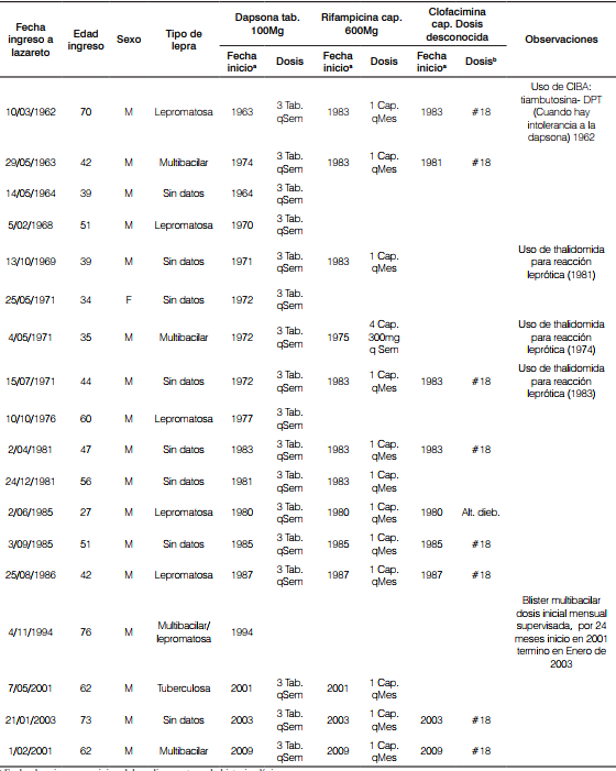 Las entrevistas y la recolección de información de fuentes primarias se hicieron por saturación de información, la cual se organizó de manera cronológica, identificando en cada periodo histórico las creencias desde el campo científico y social sobre la enfermedad, sus formas de transmisión y el tratamiento para la misma. La recopilación de información con respecto a historias clínicas y entrevistas se inició en el marco del grupo de investigación Fhiscis, en la Línea del grupo: historia social de las ciencias y sociología de las ciencias. Se acudió a diversas fuentes bibliográficas pertinentes sobre la fisiopatología, etiología, epidemiología, terapéutica y aspectos políticos y sociales de la enfermedad, de acuerdo a cada época consultada, teniendo en cuenta las categorías de análisis planteadas, que fueron: tratamiento ortodoxo de la lepra (previo y posterior a las sulfonas), creencias vernáculas y la comparación de los tratamientos según su efectividad, y su inserción o no a políticas y protocolos.