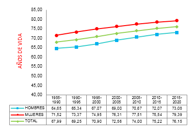 La Figura 1 muestra cómo la esperanza de vida en Colombia ha aumentado en casi diez años, desde 1985 (67,99 años) hasta 2010 (76,10 años). A pesar de que existe una diferencia de seis años entre ambos sexos, viviendo más las mujeres (79,39 años) que los hombres (73,08 años), y superando el promedio nacional (76,15 años). En general, los colombianos tienen vidas más largas.