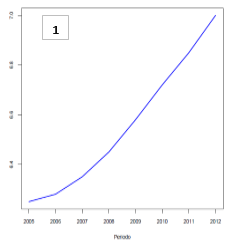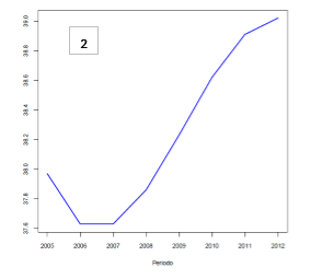 La Figura 2 y Figura 3 muestran la tendencia del envejecimiento poblacional e incluye dos indicadores del proceso de envejecimiento: el Índice de envejecimiento y el Índice de sobre-envejecimiento. Es posible notar un aumento de 6,25 a 7,0 adultos mayores por cada 100 jóvenes menores de 15 años, durante el período 2005-2012. Mientras que la proporción de personas mayores de 85 años sobre las personas mayores de 65 años fue cinco veces mayor, y se ha incrementado durante los últimos años. En 2005, era igual a 37,97 adultos mayores de 80 años y más por cada 100 personas de 65 años de edad y más, y aumentó a 39,02 en 2012.