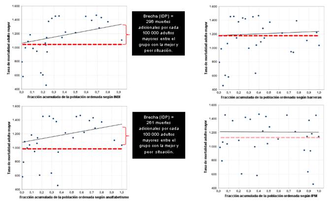 Fue posible conocer el tamaño y magnitud de estas desigualdades absolutas: necesidades básicas insatisfechas (296.099), analfabetismo (261.933) e incidencia de pobreza (189.850). Por ejemplo, el grupo de departamentos con la mejor situación (en este caso, necesidades básicas más satisfechas) presenta alrededor de 297 muertes adicionales por cada 100.000 adultos mayores, comparado con en el grupo de departamentos más pobre según necesidades básicas. Por el contrario, la pobreza multidimensional parece ser la dimensión social menos inequitativa, explicada por una pendiente casi aplanada. No obstante, las desigualdades más pequeñas están presentes en el grupo de departamentos con la peor situación o más pobres. La Figura 4 ilustra estos gradientes para cada una de las dimensiones analizadas en el año 2005.