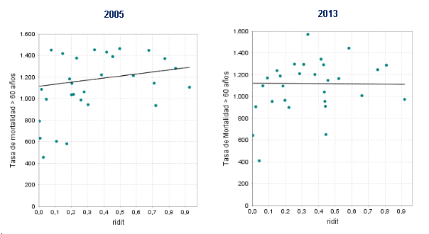 A nivel nacional, la desigualdad absoluta, según la incidencia de pobreza, se redujo de 189.850 muertes adicionales por cada 100.000 adultos mayores en 2005 a -11,199 en 2013. Esto indica una reducción de las desigualdades entre los departamentos con la menor incidencia de la pobreza. Sin embargo, la desigualdad, al parecer, se está trasladando al grupo de departamentos más pobres según incidencia de pobreza. Mientras que la desigualdad relativa, a partir del índice de concentración, es de menor tamaño. Esto indica poca concentración, tal y como refleja el índice: valores pequeños y cercanos a cero. En otras palabras, la mortalidad está acumulada uniformemente a través de todos los grupos de departamentos.
