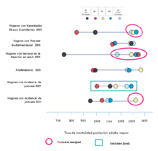En resumen, los quintiles 3, 4 y 5 han experimentado una mayor mortalidad y exclusión marginal a lo largo de todas las dimensiones sociales evaluadas. La desigualdad en la mortalidad del adulto mayor, según la incidencia de pobreza, se distribuyó incrementalmente a través de todos los quintiles, y, como resultado, se origina un gradiente lineal de desigualdad que afecta a todos los grupos de departamentos. Adicionalmente, la incidencia de pobreza fue la única medida que permitió comparaciones en el tiempo, e indica que entre los años 2005 y 2013 la brecha se ha venido cerrando entre los quintiles 2, 4 y 5. Sin embargo, esto no ha ocurrido para el quintil 3, el cual se está quedando atrás y, por tanto, la brecha se ha ampliado, resultando en una exclusión marginal.