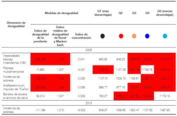 Finalmente, se estimaron los quintiles para cada dimensión social, desde quintil 1 (menos favorecidos, más pobres y con menos oportunidades) hasta quintil 5 (más favorecidos, menos pobres y con más oportunidades), con el fin de identificar brechas a lo largo de la posición social. El análisis de desigualdades se realizó para la primera (2005) y más reciente situación disponible (2013) que permitieron las fuentes de información en el momento del análisis.