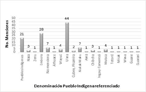 Los 131 artículos seleccionados mencionaron 18 pueblos indígenas con conductas suicidas (Figura 1), especialmente suicidios consumados juveniles por ahorcamiento y envenenamiento. Se registraron frecuentemente amenazas de suicidio colectivo en el pueblo U’wa frente al ingreso a su territorio de empresas petroleras, manifestación entrelazada con hechos históricos U’wa, quienes utilizaron en el pasado el suicidio colectivo ante la opresión colonial. La prensa enfatizó en favor de los intereses capitalistas de empresas transnacionales y en la afectación económica del país, ante la negativa indígena de permitir la explotación minera, sin valorar la cosmovisión, el arraigo y la defensa territorial del pueblo U’wa.