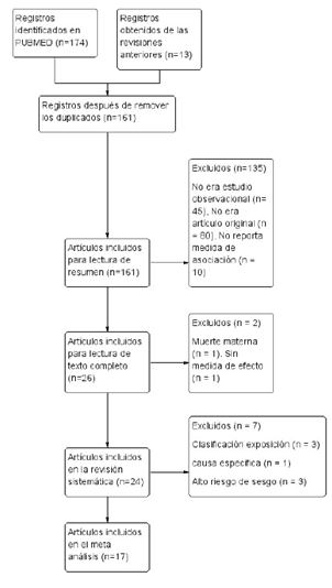 En total, fueron incluidos 24 artículos en la revisión sistemática. Siete de estas publicaciones fueron excluidas del metaanálisis: tres por clasificación no comparable de exposición, una por referirse a una causa específica de muerte y tres por alto riesgo de sesgo. La Figura 1 muestra el algoritmo de identificación y selección de estudios.