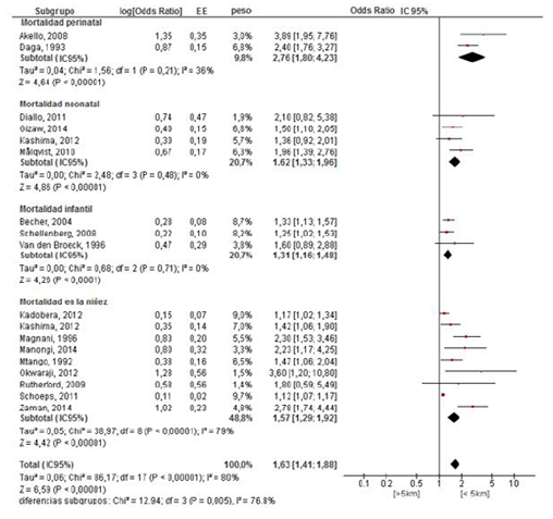 Posteriormente, en 2012, Okwaraji y Edmond 19 publicaron la segunda revisión sistemática sobre distancia y mortalidad en menores de 5 años, extendiéndose a países de bajo y mediano ingreso. Estos autores incluyeron 20 artículos en la revisión sistemática y, a partir de 13 de estos realizaron un metaanálisis que los llevó a concluir que el riesgo de mortalidad es significativamente mayor (OR 1,42; IC95% 1,23-1,63) entre los niños que viven a más de 5 km de distancia del centro de salud, comparado con los niños que viven más cerca. Los autores también identifican que este riesgo de mortalidad es significativamente mayor en el periodo perinatal (OR 2,76; IC95% 1,80-4,24) y en el periodo neonatal (OR 1,98; IC95% 1,43-2,78) para niños que viven a más de 5 km de distancia del centro de salud, comparado con quienes viven más cerca.