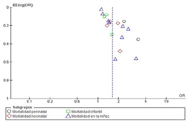 La varianza entre estudios fue significativa para la estimación en el grupo de mortalidad en la niñez (valor p < 0,01) y para la estimación de todas las edades (valor p < 0,01). En ambos casos el I2 fue cercano a 80%. En los grupos perinatal, neonatal e infantil la heterogeneidad y su impacto sobre la medida resumen no fueron significativos. Las diferencias en el OR entre los diferentes subgrupos de edad son estadísticamente significativas (valor p = 0,003) y explican cerca del 80% de la varianza en los OR de los estudios individuales.