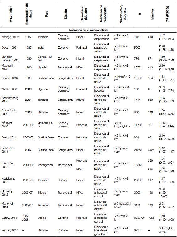 Los artículos fueron obtenidos de dos fuentes: las revisiones sistemáticas anteriores 18) (19, y búsqueda en PUBMED. Se recopilaron todos los documentos publicados hasta el 31 de mayo de 2015 que fueron identificados mediante los criterios de búsqueda: “(Healthcare Disparities[MeSH Terms] OR Community Health Services[MeSH Terms] OR Medically Underserved Area[MeSH Terms] OR Health Services Accessibility[MeSH Terms]) AND mortality AND (perinatal OR newborn OR neonatal OR infant OR child OR under-five) AND (distance OR proximity)”.