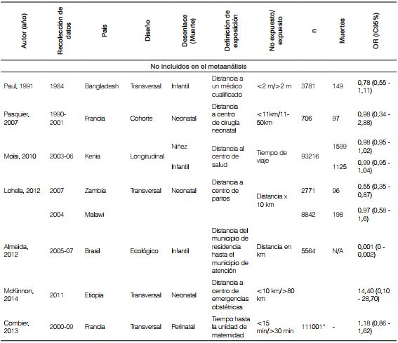 Estos dos trabajos fueron excluidos del metaanálisis por no ser comparables en la forma de medir la exposición. Otros trabajos realizados en Burkina Faso, Madagascar y Francia no encontraron asociación estadísticamente significativa. En los estudios realizados con mortalidad neonatal se incluyen, como variables de ajuste, características referentes a condiciones de vida tipo nivel educativo de la madre, etnia, ingreso y condiciones de la vivienda, y características del riesgo obstétrico tipo multiparidad, atención calificada, intervalo intergenésico y edad de la madre.