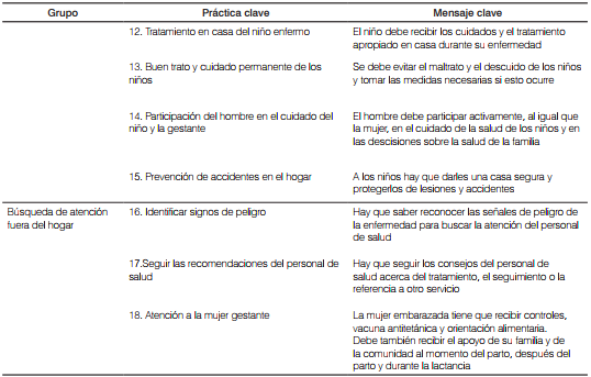 El componente comunitario consta de 18 prácticas de cuidado, distribuídas en cuatro grupos. Grupo 1: prácticas para el buen crecimiento y desarrollo físico y mental, las cuales incluyen prácticas de lactancia materna, alimentación complementaria, consumo de micronutrientes y estimulación temprana. Grupo 2: prevención de enfermedades, constituído por las prácticas de vacunación, saneamiento básico, salud oral, prevención de malaria, dengue, VIH y tuberculosis. Grupo 3: cuidados en el hogar, como son la alimentación y el cuidado adecuado del niño enfermo, la protección del maltrato y de los accidentes en el hogar, y la importancia de la participación del padre en la crianza. Grupo 4: prácticas que orientan la búsqueda de atención fuera del hogar, las cuales se basan en el reconcimiento de signos de peligro, el seguimiento de los consejos del personal de salud y la atención integral a la gestante (Tabla 1).