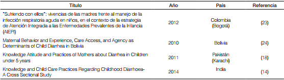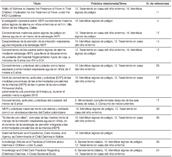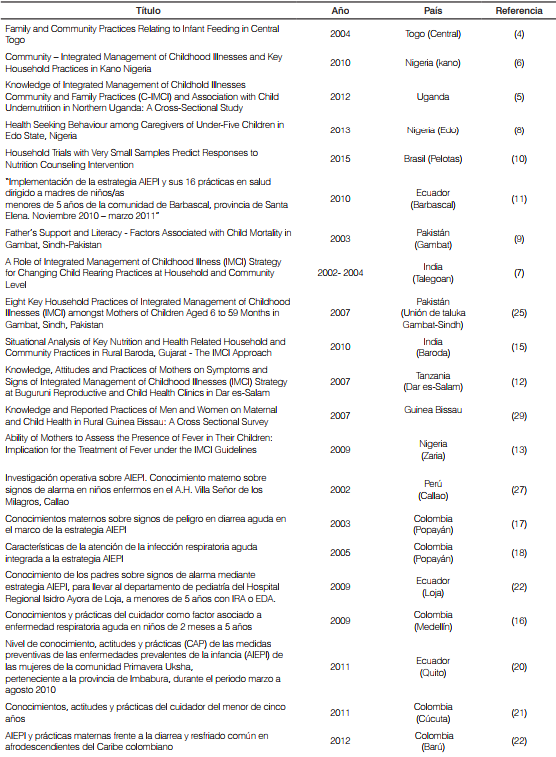 Por este motivo, el propósito de la presente revisión integradora de la literarura fue identificar y clasificar los reportes que se han publicado con respecto a la aplicación de las prácticas clave, y a los conocimientos maternos y de cuidadores de la estrategia AIEPI en el mundo. Se recopilaron publicaciones nacionales e internacionales, escritas en inglés y español, que estuvieran registradas en las bases de datos o fuentes de información Scielo, Bireme, Pubmed, Google académico y tesis académicas. Se tuvieron en cuenta los siguientes criterios de inclusión: artículos sobre prácticas clave de la estrategia AIEPI y artículos sobre conocimientos maternos y de cuidadores, relacionados con el cuidado en el hogar de alguna de las enfermedades prevalentes en la infancia. No se hizo filtro de año, ya que se querían conocer los estudios realizados en cualquier momento después de creada la estrategia.