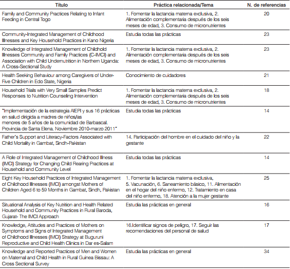 En las zonas rurales de Guinea Bissau se realizaron intervenciones participativas de educación sanitaria y/o Atención Primaria de Salud basada en la comunidad, para mejorar la supervivencia infantil. Al respecto, se concluyó que deben seguir desarrollando dichas acciones centradas en la diarrea, la malaria, la neumonía, el embarazo, el parto, atención neonatal y la cobertura de vacunación, ya que estas son las áreas donde se encontraron los conocimientos y prácticas insuficientes en este estudio29. Los estudios se realizaron sobre lactancia materna, introducción de la alimentación complemetaria, reconocimiento de los signos de peligro de muerte y de los signos de peligro de las enfermedades prevalentes. También se estudió la relación entre la aplicación de las prácticas clave y la desnutrición infantil, así como el impacto en el mejoramiento de las condiciones de salud, luego de implementar la estrategia AIEPI en el ámbito comunitario. Dichos estudios resaltan la importancia de reforzarles las actividades de sensibilización y educación a las madres y/o cuidadores, y lo relevante de la aplicacción de las Prácticas Familiares Clave en el hogar, ya que la mayoría de estos estudios coinciden en encontrar un nivel bajo de conocimiento de las mismas por parte de los familiares.