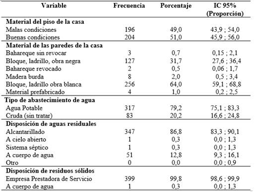 En las 400 viviendas encuestadas, se encontró que el 51,0% contaba con buenas condiciones del piso de la vivienda (baldosa en buen estado), y el 64,0 % tenían paredes en bloque, ladrillo, obra blanca, 79,2% tenían agua potable, el 86,8% contaba con un sistema de alcantarillado, el 99,8% realizaba la disposición de los residuos sólidos por medio de la empresa prestadora de servicios públicos, el 11,7% de las viviendas se encontraban cerca de un sitio de disposición de residuos sólidos y el 88,3% no se encontraban cerca de un sitio de disposición de inservibles Tabla 2.