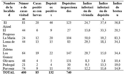 Resultados: Se analisaram 400 enquetes. A maioria de pessoas inqueridas eram mulheres entre os 18 e 33 anos, que conviviam em união livre, imputadas no regime contributivo. A maior proporção de vivendas era própria entre os estratos 1 e 2, nas quais habitavam entre 1 e 4 pessoas. As pessoas interpeladas não tinham maior conhecimento sobre o dengue ou participação em campanhas de prevenção. Das oito vilas El Ajizal apresentou os índices aédicos mais altos. O principal fator potencialmente associado na infestação domiciliaria por Ae. aegypti foi viver perto dum sitio de disposição de inservíveis, armazenagem de agua na vivenda e o controle de agua armazenada.
