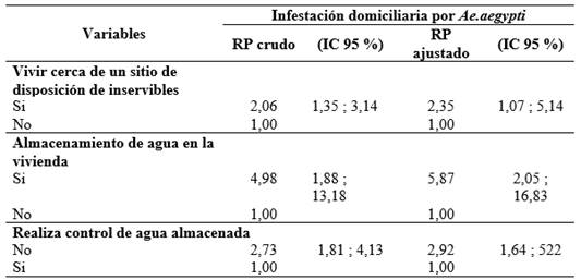 La regresión logística determinó que los factores que conservaron su significación estadística después de controlar el efecto confusor de otros factores, fueron: vivir cerca de un sitio de disposición de inservibles (RP ajustado: 2,35 IC: 1,07; 5,14), esto quiere decir que por cada vivienda infestada que no estaba cerca de un sitio de disposición de inservibles, hubo 2,35 viviendas infestadas que estaban cerca de un sitio de disposición de inservibles.
