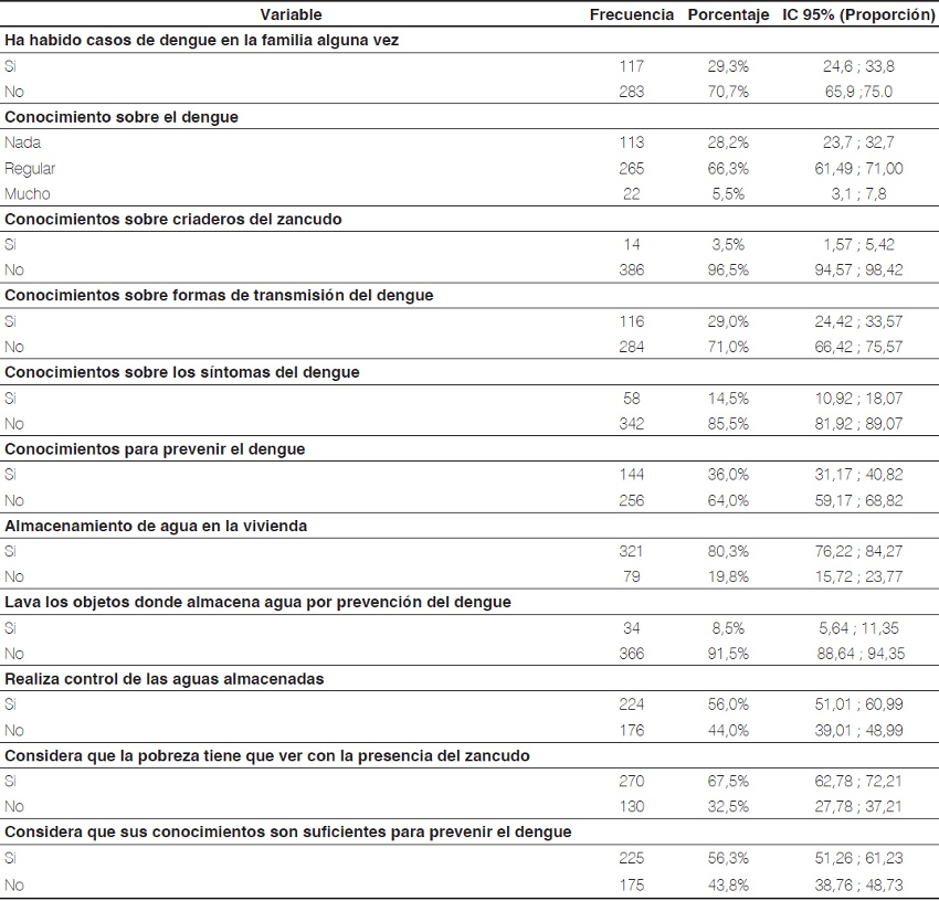 En cuanto a las características sobre conocimientos de los encuestados, el 82,8% no había participado en campañas sobre la prevención del dengue, el 79,8% considero pocas las campañas sobre este tema, el 29,3% afirmo que en su familia ha habido mínimo un caso de dengue, el 66,3% consideró que tenía un conocimiento regular sobre el dengue, el 96,5% no tenía conocimientos sobre criaderos del mosquito, el 71,0% no tenía conocimiento sobre la forma de transmisión del dengue, el 85,5% no tenían conocimientos sobre los sintomas del dengue y el 64,0% no tenía conocimientos sobre la forma de prevención.