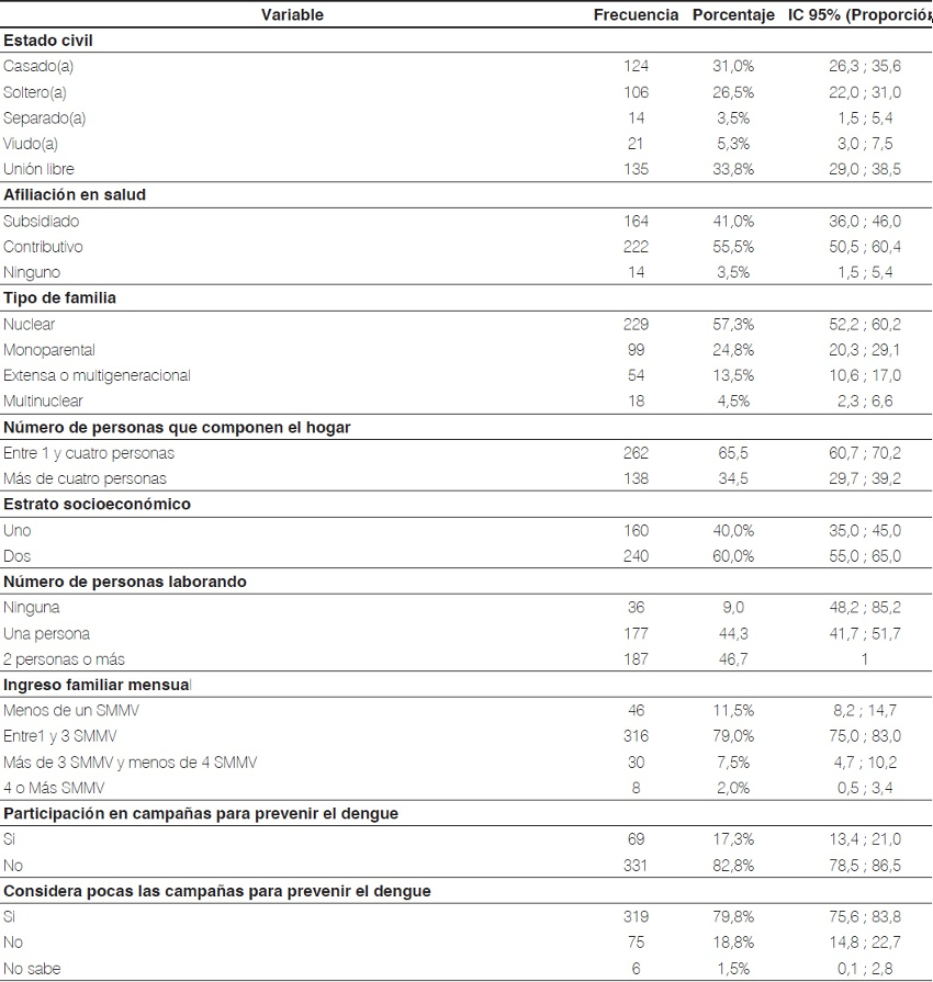 De las 400 personas encuestadas en la viviendas seleccionadas, se encontró mayor participación de las mujeres con un 85,5%, el 41,8% tenía entre 18 y 33 años, el nivel educativo que predomino fue el secundario con un 58,0%, el 33,8% convivían en unión libre, la afiliación en salud más frecuente fue el régimen contributivo con un 55,5% y el 3,5 % no tenía ningún tipo de afiliación, el 60 % de los hogares pertenecían a los estratos 1 y 2, el 50,2% de los encuestados tenían vivienda propia, el 57,3% de las familias eran nucleares y el 65,5 % pertenecían a hogares compuestos entre una y cuatro personas, en la cual en el 43,3% de las viviendas solo trabajaba una persona y en el 79% de los hogares tenían ingresos entre uno y tres Salarios Mínimos Mensuales Vigentes (SMMV).