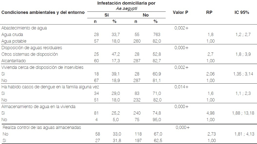 Entre los factores de conocimientos y costumbres asociados a la infestación domiciliaria por Ae. aegypti, encontrados en la investigación, está el almacenamiento de agua en la vivienda, se inspeccionaron 740 depósitos (inservibles, llantas, canecas, materas con agua y tanques) de los cuales 132 resultaron positivos. Los resultados, concuerdan con los encontrados en el municipio Playa, Ciudad de La Habana, Cuba, donde también se encontró asociación con el almacenamiento de agua en la vivienda, encontrando 35 depositos con larvas o pupas del mosquito Ae. aegypti (22).