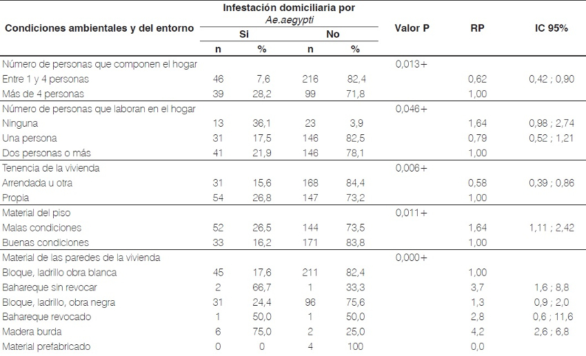 No se evidenció asociación estadísticamente significativa entre los factores demográficos y la infestación domiciliaria por Ae.aegypti, según las pruebas calculadas. En cuanto a los factores socioeconómicos, se observó potencial asociación con habitar menos de 4 personas en la vivienda (p=0,013), el número de personas laborando y la tenencia de la vivienda (arrendada u otra). En las condiciones ambientales de la vivienda y el entorno, se de|tectó asociación con el pisos en malas condiciones (p=0,011), aspecto con poca evidencia científica, como si se hace para chagas.