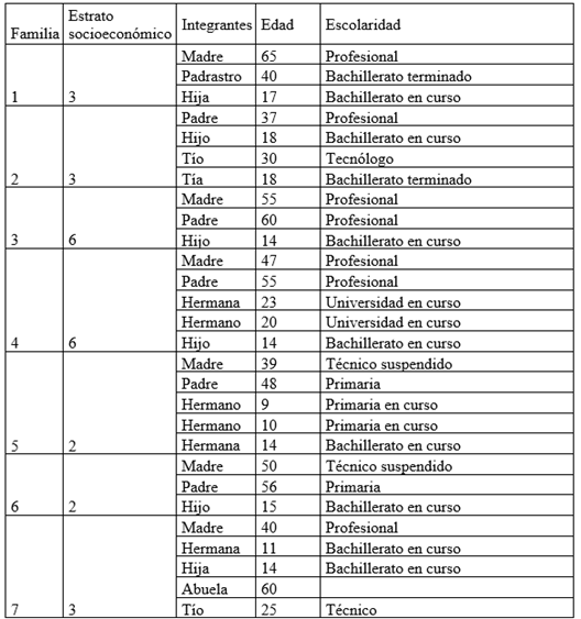 Las entrevistas son codificadas haciendo referencia al número de entrevista correspondiente a la familia (E1, E2…E7), quién fue entrevistado, es decir, si fue, padre (P), madre (M), adolescente mujer (AM) u hombre (AH) y finalmente se relaciona el estrato socioeconómico al que pertenece la familia (2) (3) (6). A continuación, en la tabla 1, se detalla algunas características sociodemográficas de la población participante, teniendo en cuenta su organización familiar.