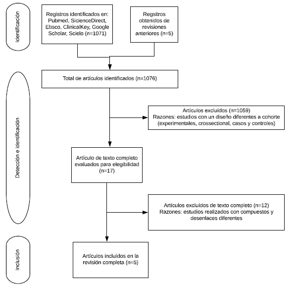 En la búsqueda inicial se identificaron 1076 estudios en total. De estos, en la revisión por títulos y resumen se excluyen 1059 que no cumplieron con los criterios de inclusión (estudios experimentales, crossectional, casos y controles, revisiones y comentarios). 17 artículos fueron seleccionados para lectura completa, de los cuales se excluyeron 12, dado que evaluaron compuestos químicos persistentes. Finalmente, 5 artículos fueron incluidos en la revisión sistemática. En la figura 1, se muestra el proceso de identificación, detección, elección e inclusión final.