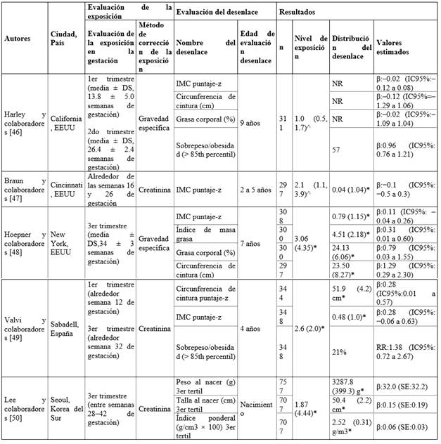 En esta revisión se incluyeron cinco estudios de cohorte prospectivo, de los cuales, cuatro mostraron que los altos niveles de concentración de BPA en las mujeres embarazadas se asociaron positivamente con la incidencia de IMCz, sobrepeso/obesidad, índice de masa grasa y circunferencia de cintura, pero en la mayoría esta relación no fue estadísticamente significativa, por lo cual, se necesitan más datos prospectivos para que la evidencia sea más robusta.