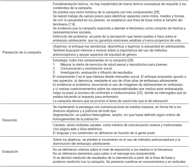 El lenguaje de la campaña, por su parte, es calificado por las ejecutoras como apropiado para los jóvenes y de choque para adultos, al considerarlo como promotor del sexo; mientras que, para los expertos, es fuerte, llama a la reflexión y genera controversia con temas éticos. Según afirmaciones de agentes de influencia, como padres de familia y educadores, la campaña promovía, mediante su lenguaje, comportamientos opuestos a lo que asumen como sano y adecuado 24. Se encontró que una de las principales falencias de la comunicación fue que la estrategia de intervención se enfocó en el sector salud, cuando el problema es de educación, y que el proceso comunicativo fue funcionalista, de carácter informativo más que formativo 25.