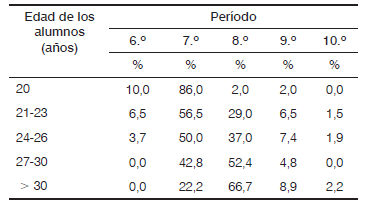 El curso de Medicina se completa en doce períodos. Se obtuvieron y analizaron 235 cuestionarios, con la siguiente distribución: 51 cuestionarios de académicos del 6.º período, 60 del 7.º, 57 del 8.º, 22 del 9.º, y 45 del 10.º período. La distribución de los participantes por grupo de edad se presenta en la Tabla 1.