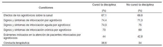 Acerca de los signos y síntomas de intoxicaciones por agrotóxicos, el grado medio de aciertos fue del 74,4 % en alumnos que cursaron la disciplina, mientras que para aquellos que no cursaron fue del 71,3 %.