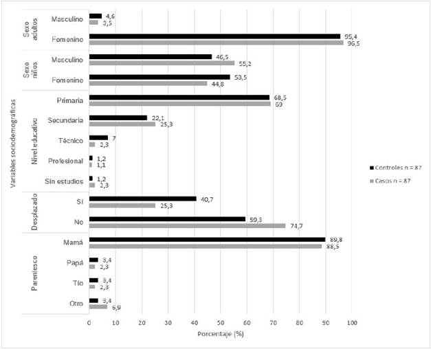 El rango intercuartil (RIq) de la edad de los acudientes en el grupo casos es 13, con una mediana de 28, mientras que en el grupo controles el RIq es 12, con una mediana de 23, mostrando una dispersión similar en esta categoría en ambos grupos. En la edad de los niños evaluados, el grupo casos tuvo una mediana de 4 y el grupo controles una mediana de 1; para ambos grupos, el RIq tuvo un valor de 2.