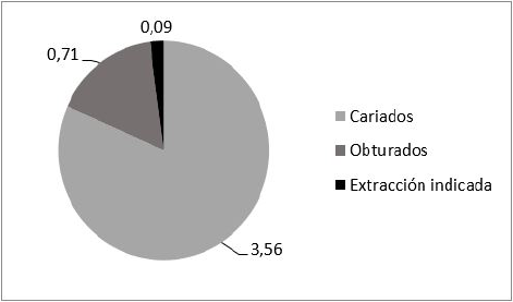 El promedio de dientes cariados fue de 3,5 dientes (Desviación estándar -DE- = 3,5), así como la media del índice ceo-d en los niños menores de 5 años fue 4,3 dientes (DE = 3,4) (Figura 2).