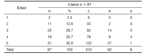 Al evaluar la distribución de la caries dentro del estudio, se observa que a medida que aumenta la edad de los niños evaluados, también crece la prevalencia de la caries dental. En los niños de 1 año es del 2 % y en los de 5 años aumenta al 36 % (Tabla 1).