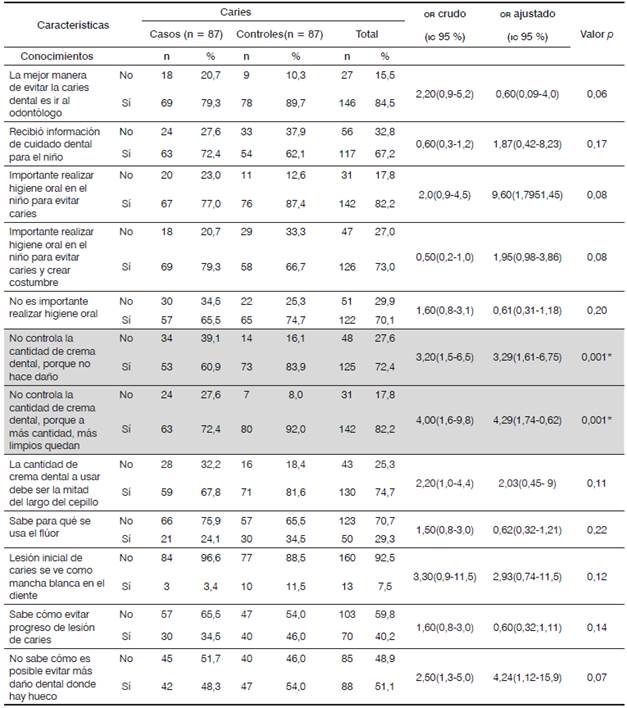 Los niños de quienes sus tutores no sabían cómo evitar el progreso de la caries dental cuando esta ya ha hecho una cavidad tienen 2,5 más probabilidades de generar caries dental, que aquellos menores cuyos acudientes conocían las actividades para evitar el avance de la lesión cavitaria (OR = 2,5; IC 95 % = 1,3-5,0).