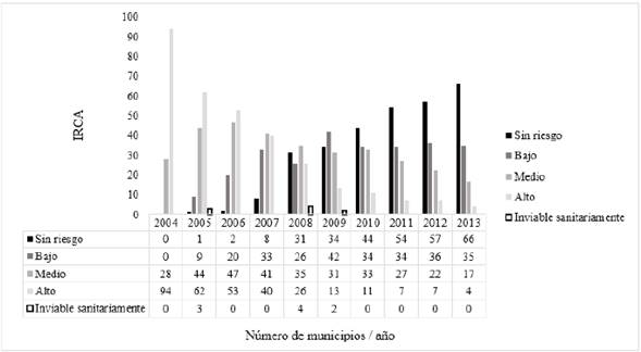 De los 122 municipios incluidos en el año 2004, el 77 % (94) se encontraba con irca en riesgo alto, y el 23 % (28) restante, en riesgo medio. A través del tiempo, se evidenció la disminución en el nivel de riesgo, hallándose, en el año 2013, el 54 % (66) sin riesgo; el 29 % (35) en riesgo bajo; el 14 % (17) en riesgo medio, y el 3 % (4) en riesgo alto.
