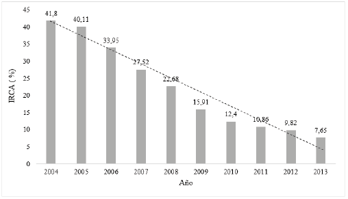 Results: In 2004, in 122 municipalities of Boyacá, 77% had an irca at high risk and 23% at medium risk. Over time, the re has been a decrease in the level of risk, 3% had high risk, 14% medium risk, 29% low risk and 54% were without risk in 2013.