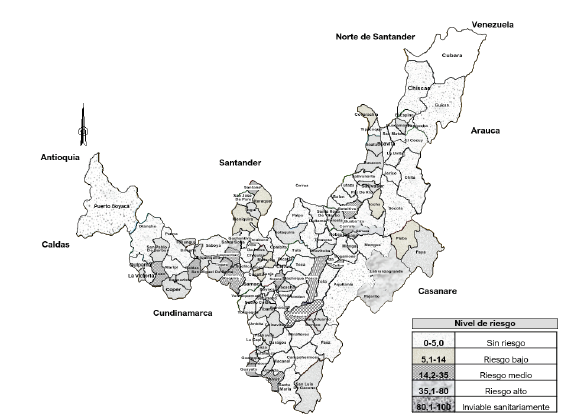 En un estudio realizado en el año 2010, en el departamento del Tolima se encontró que el 64 % (30) de los municipios presentó algún tipo de riesgo en el agua para consumo humano y el 36 % (19) tuvo agua sin riesgo [2], similar a lo reportado en ese año en el departamento de Boyacá, en el que el 63 % (78) de los municipios presentó riesgo y el 37 % (44) distribuyó agua sin riesgo.