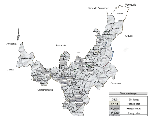 Cabe resaltar que la implementación de nueva normativa, como la Resolución 4716 del año 2010 [23], que reglamenta las disposiciones generales para la elaboración de mapas de riesgo, va a permitir intervenir los riesgos existentes desde la fuente, y establecer estrategias para implementar acciones que permitan disminuir el nivel de riesgo para lograr y mantener un irca menor al 5 % (sin riesgo) en todo el departamento, con el objeto de mejorar la calidad de vida de la comunidad boyacense.