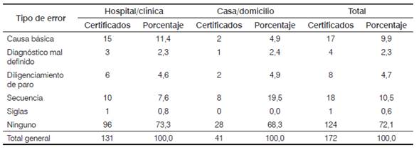 Resultados: Se diligenciaron 172 certificados de defunción. De acuerdo con el sitio de defunción, 131 fallecimientos ocurrieron en la institución de salud y 41 en casa/domicilio; en el 9,9 % se identificó error de causa básica, y en el 10,5 %, ausencia de la secuencia; hubo concordancia en la causa básica en 55,9 % de las certificaciones.
