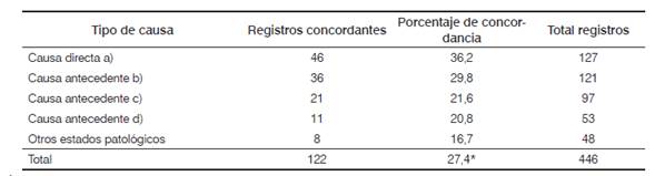 De acuerdo con los resultados de la Tabla 3, se obtiene un índice global de concordancia de 27,4 %, siendo la causa con mayor concordancia la “Causa directa”, y la de menor, la causa de “Otros estados patológicos”, solo observada en 1 de cada 6 certificados diligenciados.