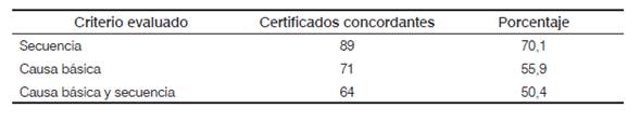 Frente al ejercicio de concordancia como metodología de evaluación, esta fue identificada en un 56 % para la causa básica, y al tomar en cuenta otras causas básicas alternativas y plausibles, de acuerdo con lo descrito en la historia clínica, el porcentaje aumentó al 72 %.