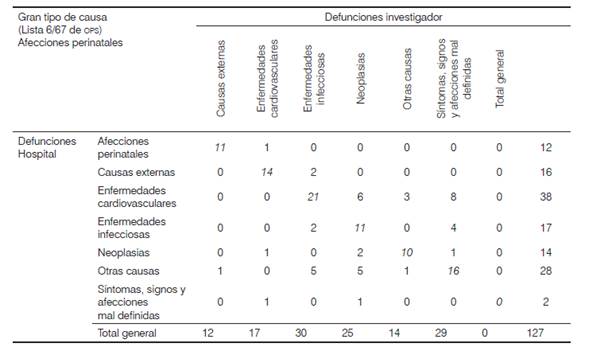 Al evaluar las causas diligenciadas, se estableció si la secuencia y la causa básica diligenciadas por Hospital e investigador coincidían, independientemente de la concordancia entre la cantidad de diagnósticos diligenciados y la concordancia entre el diagnóstico para el mismo tipo de causa [Tabla 4].