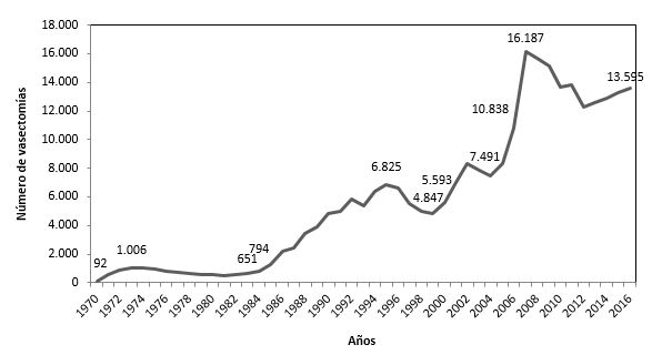 En 1970, Profamilia inicia el servicio de vasectomía, atendiendo a 92 usuarios. A partir de 1984, el número de vasectomías efectuadas se incrementa anualmente. En el periodo de tiempo de 2000 a 2006 se duplica el número de vasectomías. No obstante, el mayor número de vasectomías llevadas a cabo se presentó en 2007 (16 187), como se muestra en la Figura 1.