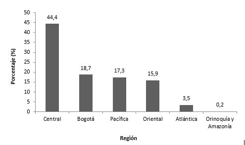 La región Central, que comprende los departamentos de Antioquia, Caldas, Risaralda, Quindío, Tolima, Huila y Caquetá, concentra el mayor porcentaje de hombres vasectomizados (44,4 %), seguida por Bogotá (18,7 %), como se muestra en la Figura 2. En la región de la Orinoquía y Amazonía es de 0,2 %, y en la región Atlántica es de 3,5 %.