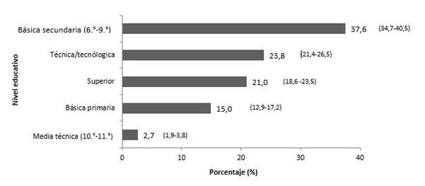 La Figura 4 presenta la distribución de la población masculina colombiana por nivel educativo. El 37 % de los hombres analizados ha cursado algún año de educación básica secundaria (6.º a 9.º grado). En alguna medida, corresponde a lo reportado en la ends [16]: el 38 % de los hombres vasectomizados de 13 a 59 años ha cursado algún año de educación básica secundaria (6.° a 9.° grado).