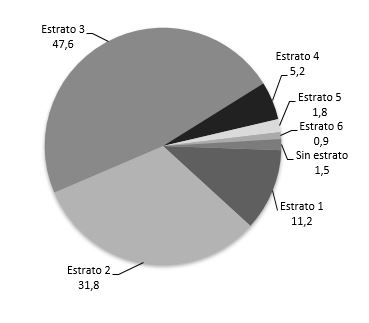 De acuerdo con el Registro de usuarios de servicios de Profamilia, cerca de la mitad de los usuarios (47,6 %) pertenece al estrato 3, mientras que el 31,8 % pertenece al estrato 2 y tan solo el 11 % al estrato 1 (véase Figura 5].Esta distribución porcentual es similar a la encontrada en la ends 2015 (16) entre los usuarios de vasectomía: el 48 y el 32 % de las vasectomías se la han realizado hombres de los estratos 3 y 2, respectivamente [16].