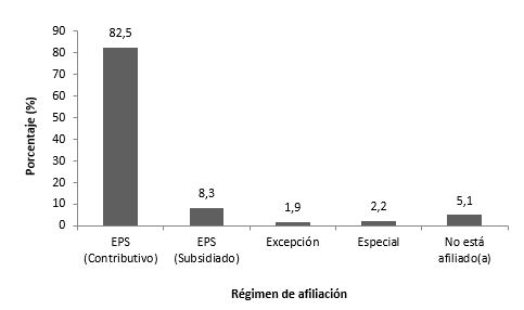 En la Figura 6 se observan las vasectomías según tipo de aseguramiento en salud. La mayoría de los hombres que se han realizado la vasectomía pertenecen al régimen contributivo (83 %), mientras que el 5 % reporta no estar afiliado a ningún régimen. Los regímenes especial y de excepción, que cubren los militares, policías, magisterio y trabajadores del sector petrolero, tienen los porcentajes más bajos de vasectomía: 2,2 y 1,9 %, respectivamente.