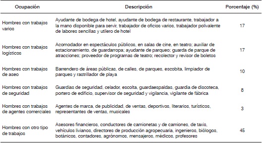La Tabla 1 presenta las vasectomías según seis grandes grupos de ocupación de los hombres. Solo el 52 % de los hombres reportaron esta variable y la desagregación de los datos permitió identificar seis grupos de ocupaciones comunes: 1) Hombres con trabajos varios, 2) Hombres con trabajos logísticos, 3) Hombres con trabajos de aseo, 4) Hombres con trabajos de seguridad, 5) Hombres con trabajos de agentes comerciales, y 6) hombres con otro tipo de trabajo (ocupaciones que presentan bajos porcentajes, inferiores de 2 %).