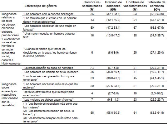 Finalmente, con relación a los imaginarios sobre estereotipos masculinos relacionados con la sexualidad, se diseñó un indicador que indaga el estar de acuerdo con las siguientes afirmaciones: 1) “Los hombres necesitan más sexo que las mujeres”, 2) “Los hombres no hablan de sexo, lo hacen”, y 3) “Los hombres siempre están listos para tener sexo”. Con base en este indicador, se encontró que entre los hombres que se han realizado la vasectomía, estos imaginarios están presentes en el 58 % (55,0-60,8), mientras que para los hombres que no se la han hecho es del 64 % (63,8-64,8). Se muestra, así, cómo los roles de género ejercen un papel importante frente al ejercicio de la sexualidad.