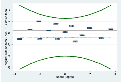 The impact of DIF items on the functional measurement was analyzed with the Bland-Altman agreement plot by comparing person estimates (and standard errors) between the original scale and the unbiased scale (without DIF items).